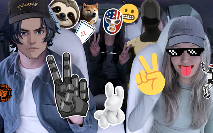 Zmień swój samochód w fotobudkę! Rób selfie z wnętrza Tesli i zmieniaj swój wygląd za pomocą zabawnych filtrów, naklejek i emotikonów. Dziel się stylowymi zdjęciami z przyjaciółmi i rodziną bezpośrednio z aplikacji Tesla. Samochód musi być zaparkowany. Wymagana jest aplikacja Tesla w wersji 4.51.5+.